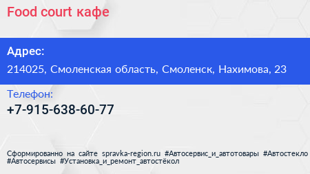 Food court, кафе по адресу 214025, Смоленская область, Смоленск, Нахимова, 23 в дальнейшем Организация, размещена в следующих категориях: