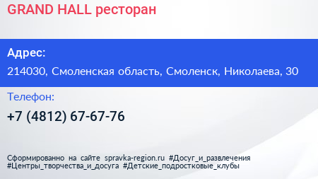GRAND HALL, ресторан по адресу 214030, Смоленская область, Смоленск, Николаева, 30 в дальнейшем Организация, размещена в следующих категориях: