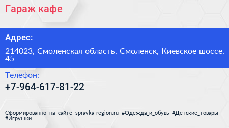 Гараж, кафе по адресу 214023, Смоленская область, Смоленск, Киевское шоссе, 45 в дальнейшем Организация, размещена в следующих категориях: