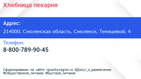 Хлебница, пекарня по адресу 214000, Смоленская область, Смоленск, Тенишевой, 4 в дальнейшем Организация, размещена в следующих категориях: