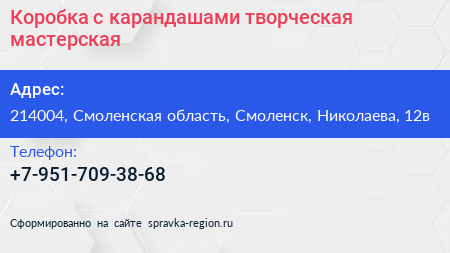 Коробка с карандашами, творческая мастерская по адресу 214004, Смоленская область, Смоленск, Николаева, 12в в дальнейшем Организация, размещена в следующих категориях: