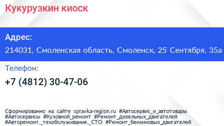 Кукурузкин, киоск по адресу 214031, Смоленская область, Смоленск, 25 Сентября, 35а в дальнейшем Организация, размещена в следующих категориях: