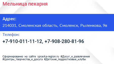 Мельница, пекарня по адресу 214031, Смоленская область, Смоленск, Рыленкова, 9в в дальнейшем Организация, размещена в следующих категориях: