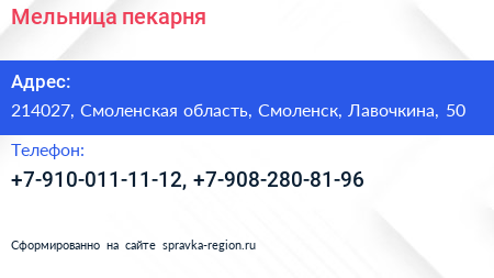 Мельница, пекарня по адресу 214027, Смоленская область, Смоленск, Лавочкина, 50 в дальнейшем Организация, размещена в следующих категориях: