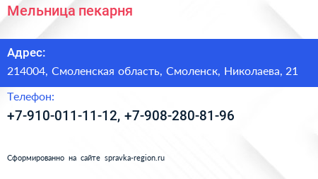 Мельница, пекарня по адресу 214004, Смоленская область, Смоленск, Николаева, 21 в дальнейшем Организация, размещена в следующих категориях: