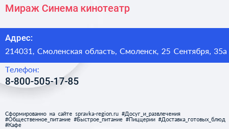Мираж Синема, кинотеатр по адресу 214031, Смоленская область, Смоленск, 25 Сентября, 35а в дальнейшем Организация, размещена в следующих категориях: