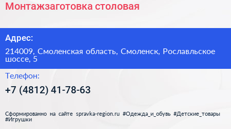 Монтажзаготовка, столовая по адресу 214009, Смоленская область, Смоленск, Рославльское шоссе, 5 в дальнейшем Организация, размещена в следующих категориях: