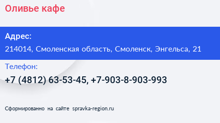 Оливье, кафе по адресу 214014, Смоленская область, Смоленск, Энгельса, 21 в дальнейшем Организация, размещена в следующих категориях:
