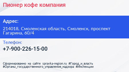 Пионер кофе, компания по адресу 214018, Смоленская область, Смоленск, проспект Гагарина, 60/4 в дальнейшем Организация, размещена в следующих категориях: