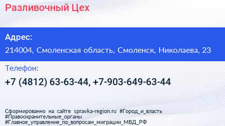 Разливочный Цех по адресу 214004, Смоленская область, Смоленск, Николаева, 23 в дальнейшем Организация, размещена в следующих категориях: