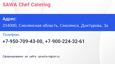 SAWA Chef & Catering по адресу 214000, Смоленская область, Смоленск, Дохтурова, 3а в дальнейшем Организация, размещена в следующих категориях:
