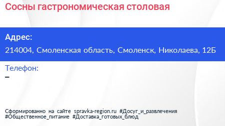 Сосны, гастрономическая столовая по адресу 214004, Смоленская область, Смоленск, Николаева, 12Б в дальнейшем Организация, размещена в следующих категориях:
