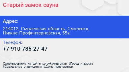Старый замок, сауна по адресу 214012, Смоленская область, Смоленск, Нижне-Профинтерновская, 55а в дальнейшем Организация, размещена в следующих категориях: