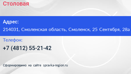 Столовая по адресу 214031, Смоленская область, Смоленск, 25 Сентября, 28а в дальнейшем Организация, размещена в следующих категориях: