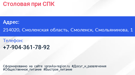 Столовая при СПК по адресу 214020, Смоленская область, Смоленск, Смольянинова, 1 в дальнейшем Организация, размещена в следующих категориях: