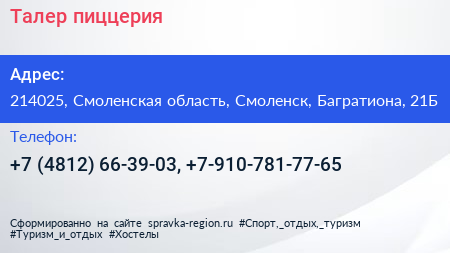 Талер, пиццерия по адресу 214025, Смоленская область, Смоленск, Багратиона, 21Б в дальнейшем Организация, размещена в следующих категориях: