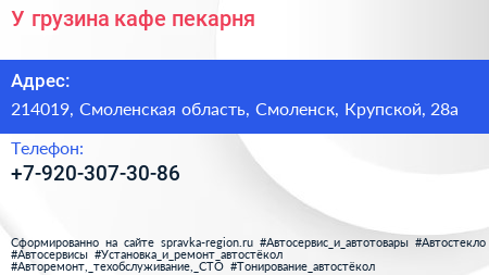 У грузина, кафе-пекарня по адресу 214019, Смоленская область, Смоленск, Крупской, 28а в дальнейшем Организация, размещена в следующих категориях: