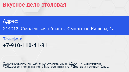 Вкусное дело, столовая по адресу 214012, Смоленская область, Смоленск, Кашена, 1а в дальнейшем Организация, размещена в следующих категориях: