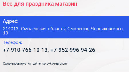 Все для праздника, магазин по адресу 214013, Смоленская область, Смоленск, Черняховского, 13 в дальнейшем Организация, размещена в следующих категориях: