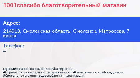 1001спасибо, благотворительный магазин по адресу 214013, Смоленская область, Смоленск, Матросова, 7 киоск в дальнейшем Организация, размещена в следующих категориях: