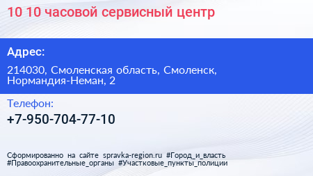 10:10, часовой сервисный центр по адресу 214030, Смоленская область, Смоленск, Нормандия-Неман, 2 в дальнейшем Организация, размещена в следующих категориях: