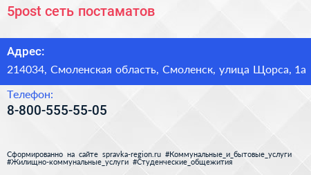 5post, сеть постаматов по адресу 214034, Смоленская область, Смоленск, улица Щорса, 1а в дальнейшем Организация, размещена в следующих категориях: