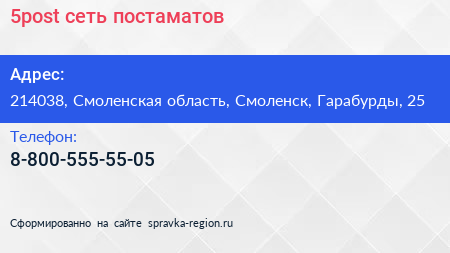 5post, сеть постаматов по адресу 214038, Смоленская область, Смоленск, Гарабурды, 25 в дальнейшем Организация, размещена в следующих категориях: