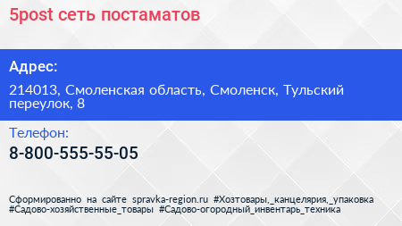 5post, сеть постаматов по адресу 214013, Смоленская область, Смоленск, Тульский переулок, 8 в дальнейшем Организация, размещена в следующих категориях: