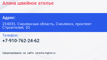 Алина, швейное ателье по адресу 214031, Смоленская область, Смоленск, проспект Строителей, 10 в дальнейшем Организация, размещена в следующих категориях: