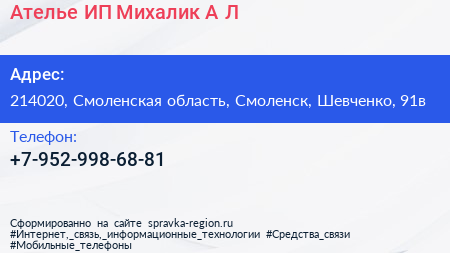Ателье, ИП Михалик А.Л. по адресу 214020, Смоленская область, Смоленск, Шевченко, 91в в дальнейшем Организация, размещена в следующих категориях:
