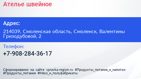 Ателье швейное по адресу 214039, Смоленская область, Смоленск, Валентины Гризодубовой, 2 в дальнейшем Организация, размещена в следующих категориях: