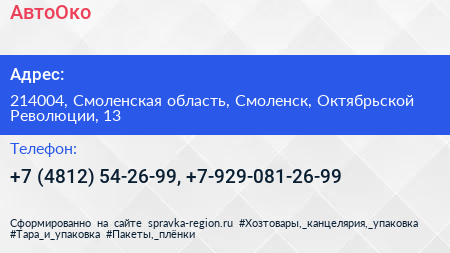 АвтоОко по адресу 214004, Смоленская область, Смоленск, Октябрьской Революции, 13 в дальнейшем Организация, размещена в следующих категориях: