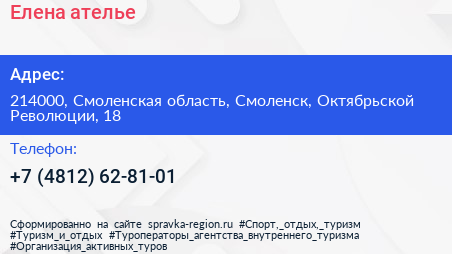 Елена, ателье по адресу 214000, Смоленская область, Смоленск, Октябрьской Революции, 18 в дальнейшем Организация, размещена в следующих категориях: