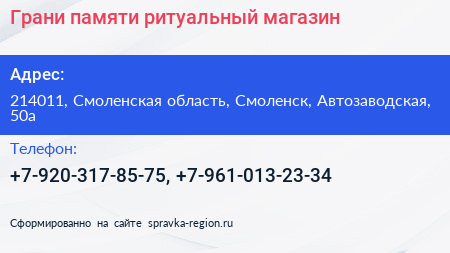 Грани памяти, ритуальный магазин по адресу 214011, Смоленская область, Смоленск, Автозаводская, 50а в дальнейшем Организация, размещена в следующих категориях: