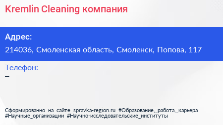 Kremlin Cleaning, компания по адресу 214036, Смоленская область, Смоленск, Попова, 117 в дальнейшем Организация, размещена в следующих категориях: