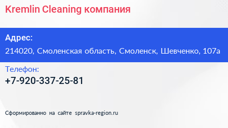 Kremlin Cleaning, компания по адресу 214020, Смоленская область, Смоленск, Шевченко, 107а в дальнейшем Организация, размещена в следующих категориях: