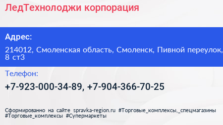 ЛедТехнолоджи, корпорация по адресу 214012, Смоленская область, Смоленск, Пивной переулок, 8 ст3 в дальнейшем Организация, размещена в следующих категориях: