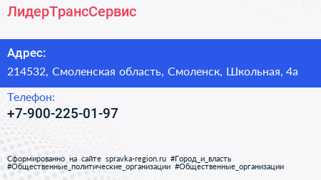 ЛидерТрансСервис по адресу 214532, Смоленская область, Смоленск, Школьная, 4а в дальнейшем Организация, размещена в следующих категориях: