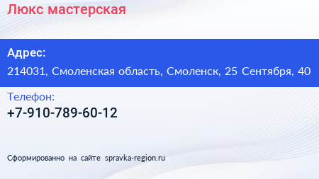 Люкс, мастерская по адресу 214031, Смоленская область, Смоленск, 25 Сентября, 40 в дальнейшем Организация, размещена в следующих категориях: