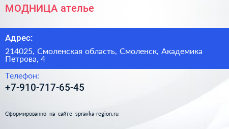 МОДНИЦА, ателье по адресу 214025, Смоленская область, Смоленск, Академика Петрова, 4 в дальнейшем Организация, размещена в следующих категориях: