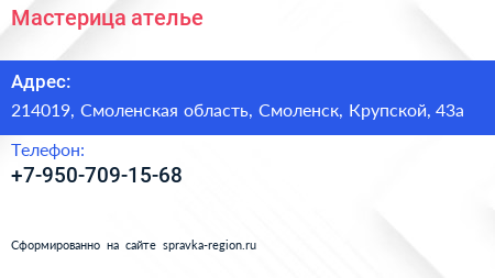 Мастерица, ателье по адресу 214019, Смоленская область, Смоленск, Крупской, 43а в дальнейшем Организация, размещена в следующих категориях: