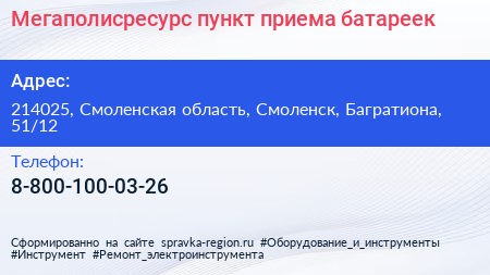 Мегаполисресурс, пункт приема батареек по адресу 214025, Смоленская область, Смоленск, Багратиона, 51/12 в дальнейшем Организация, размещена в следующих категориях: