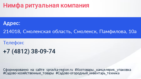 Нимфа, ритуальная компания по адресу 214018, Смоленская область, Смоленск, Памфилова, 10а в дальнейшем Организация, размещена в следующих категориях: