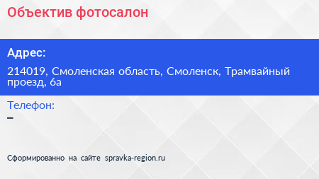 Объектив, фотосалон по адресу 214019, Смоленская область, Смоленск, Трамвайный проезд, 6а в дальнейшем Организация, размещена в следующих категориях:
