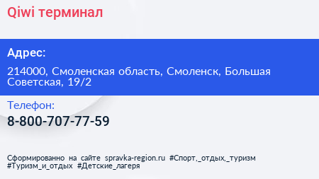 Qiwi, терминал по адресу 214000, Смоленская область, Смоленск, Большая Советская, 19/2 в дальнейшем Организация, размещена в следующих категориях: