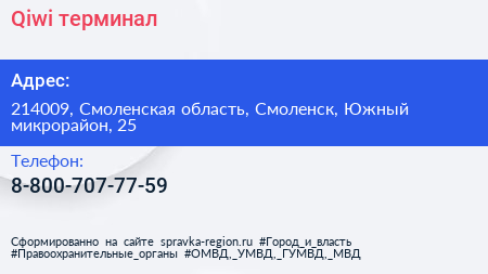 Qiwi, терминал по адресу 214009, Смоленская область, Смоленск, Южный микрорайон, 25 в дальнейшем Организация, размещена в следующих категориях:
