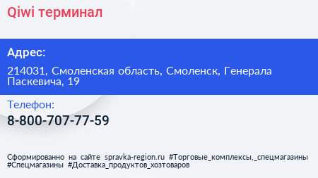 Qiwi, терминал по адресу 214031, Смоленская область, Смоленск, Генерала Паскевича, 19 в дальнейшем Организация, размещена в следующих категориях: