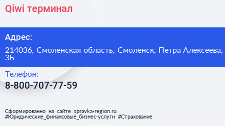 Qiwi, терминал по адресу 214036, Смоленская область, Смоленск, Петра Алексеева, 3Б в дальнейшем Организация, размещена в следующих категориях: