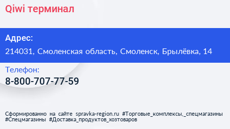 Qiwi, терминал по адресу 214031, Смоленская область, Смоленск, Брылёвка, 14 в дальнейшем Организация, размещена в следующих категориях: