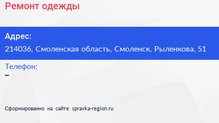 Ремонт одежды по адресу 214036, Смоленская область, Смоленск, Рыленкова, 51 в дальнейшем Организация, размещена в следующих категориях: